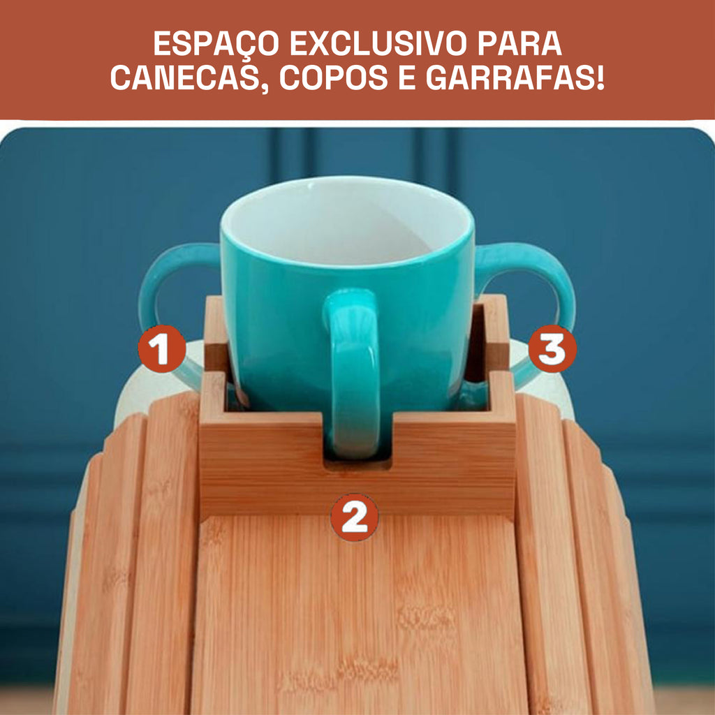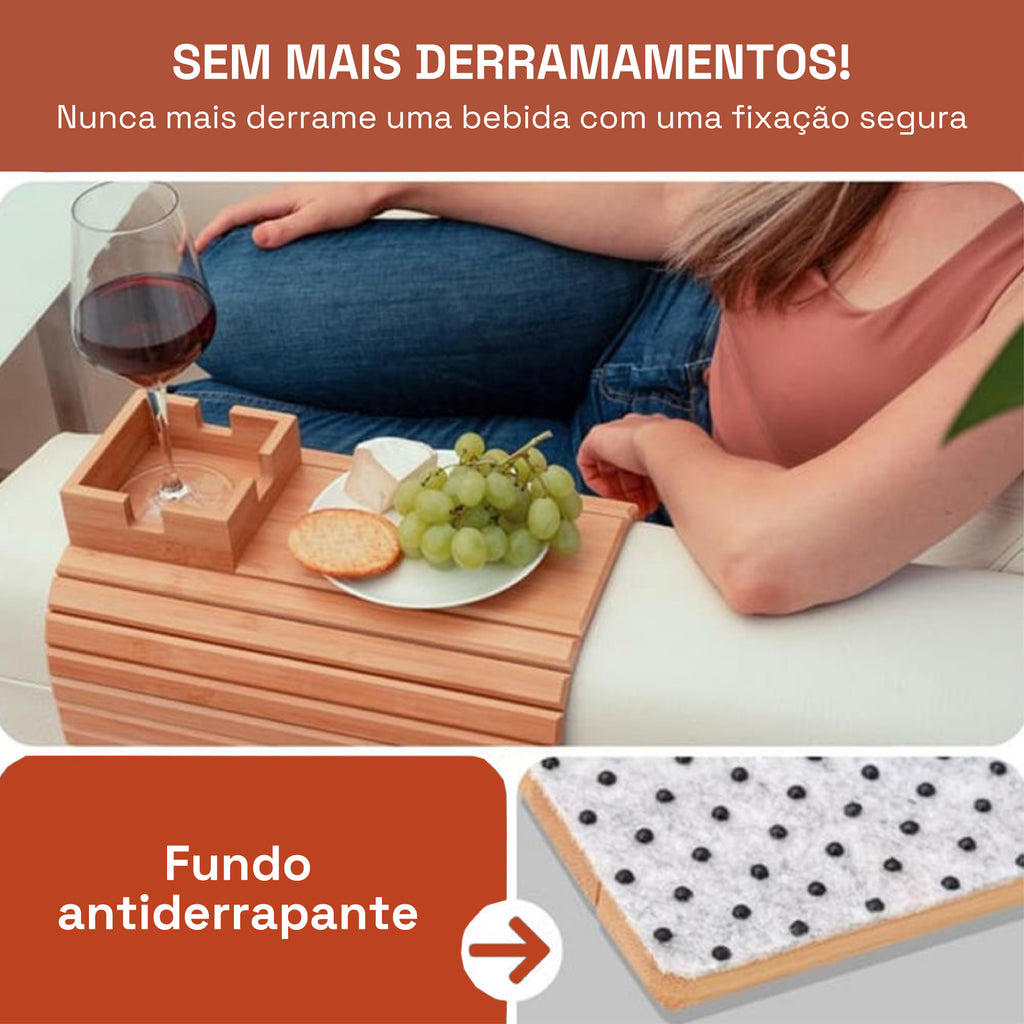Transforme seu sofá com estilo e funcionalidade! Bandeja de bambu com porta-copos, sustentável e ideal para evitar bagunça.